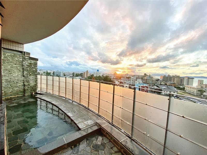 当館の温泉は海中から湧き出る源泉掛け流しの湯。上階の展望浴場から、日本海や米子の街並みを眺めつつ、朝と夜で異なる湯船を堪能することができます。