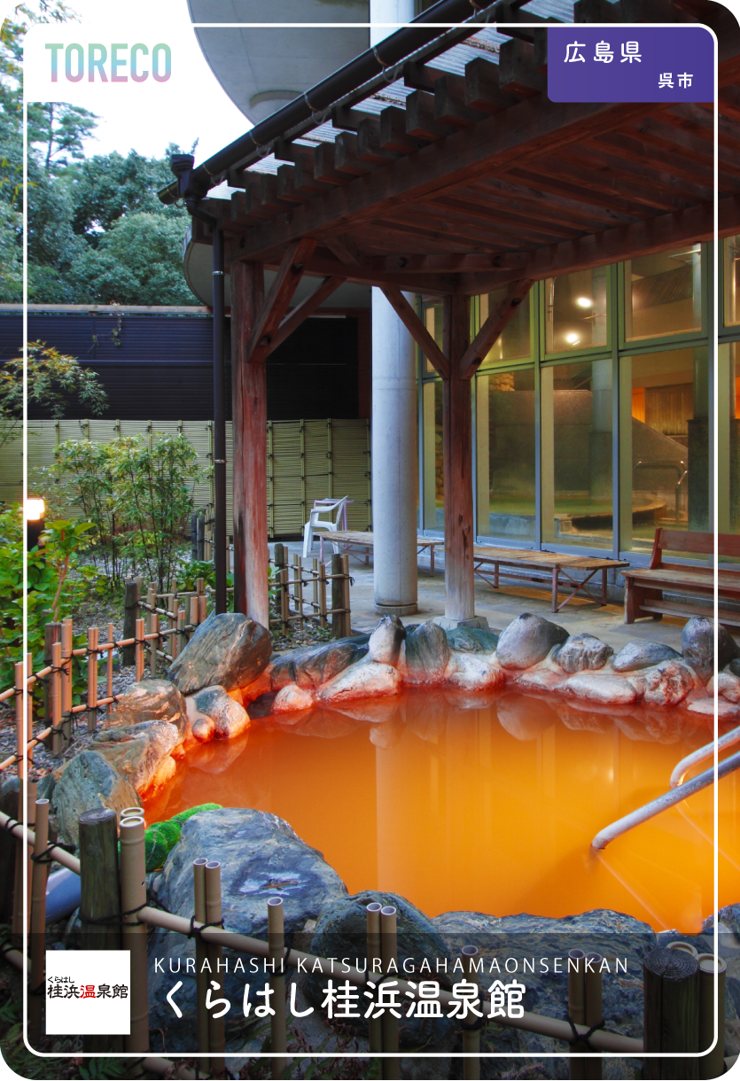 | おすすめポイント | くらはし桂浜温泉館は、万葉集に詠まれた桂浜と、瀬戸内海を一望できる火山に囲まれた景勝地に佇む日帰り温泉施設で、年間約9万人にご利用いただいています。 地下1650mから汲み揚げる源泉は、鉄分、塩分などを豊富に含む含弱放射能-ナトリウム-塩化物泉で、多岐にわたる適応症を持つ、全国屈指の良質な療養温泉です。 趣の異なる「石の風呂」と「海の風呂」は男女週替わりで楽しめ、源泉露天風呂やサウナを備えています。 館内にはレストランやカフェ、ショップも完備。周辺には観光施設なども多く、倉橋島の観光拠点としても最適です。 |