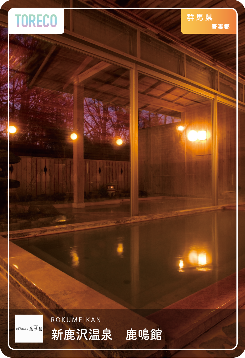 | おすすめポイント | 群馬と長野の県境にある人通りの少ない鄙びた温泉地『鹿沢温泉』 その古くから湯治場として人々に親しまれてきた名湯・鹿沢温泉の源泉を引湯しておりますので、内風呂・露天風呂共に100%源泉かけ流しの温泉をご堪能ください。 景色が自慢の露天風呂は開放的で新緑・紅葉と四季折々の景色をご覧いただけます(冬季は寒さが大変厳しい為、露天風呂の営業を見合わせております) お食事は地場産の食材を多く取り入れたお料理です。嬬恋の恵まれた土地が育んだ季節の美味を生かし、一品一品をまごころ込めてお造りしております。美肌の湯と上州のごちそうをのんびりと満喫しに、ぜひ「鹿鳴館」へお越しください。 |