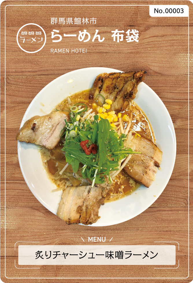 群馬県館林市のらーめん 布袋では濃厚濃いめの味噌らーめんにじっくり煮込んで柔らかくし、特製醤油タレで味付けした豚バラチャーシューを提供時にバーナーで炙り香ばしくしています