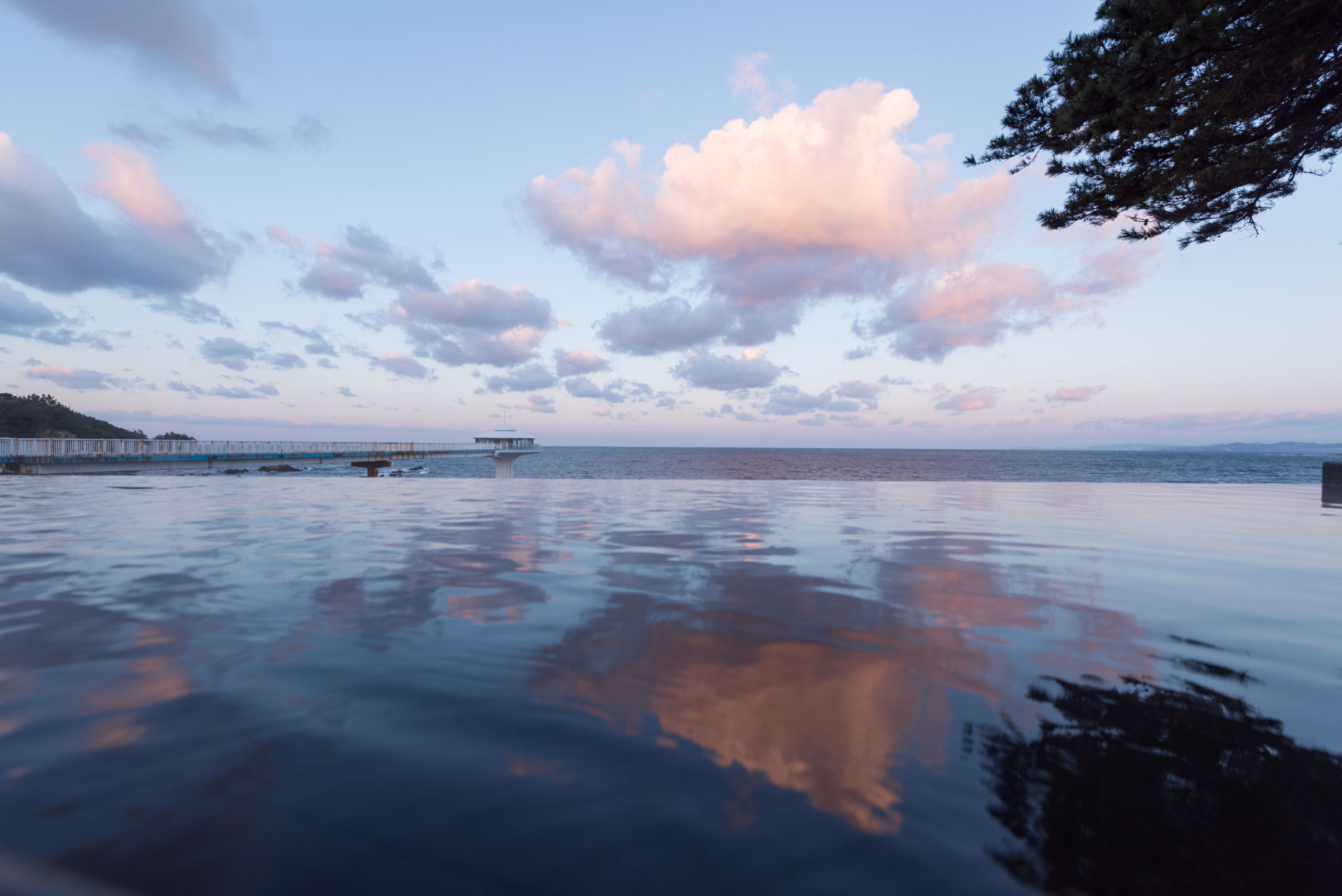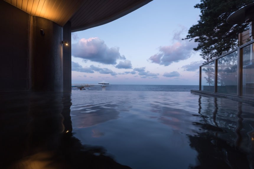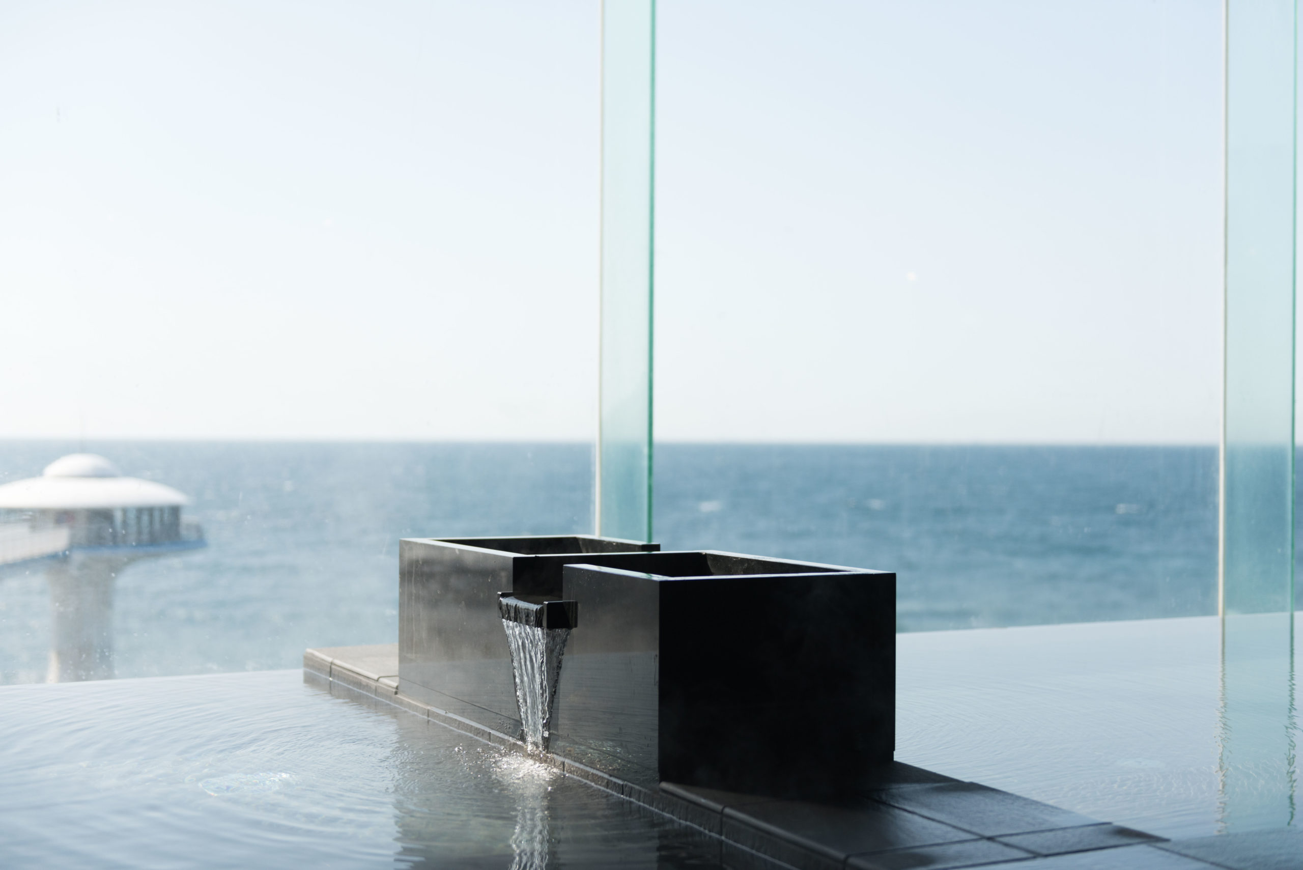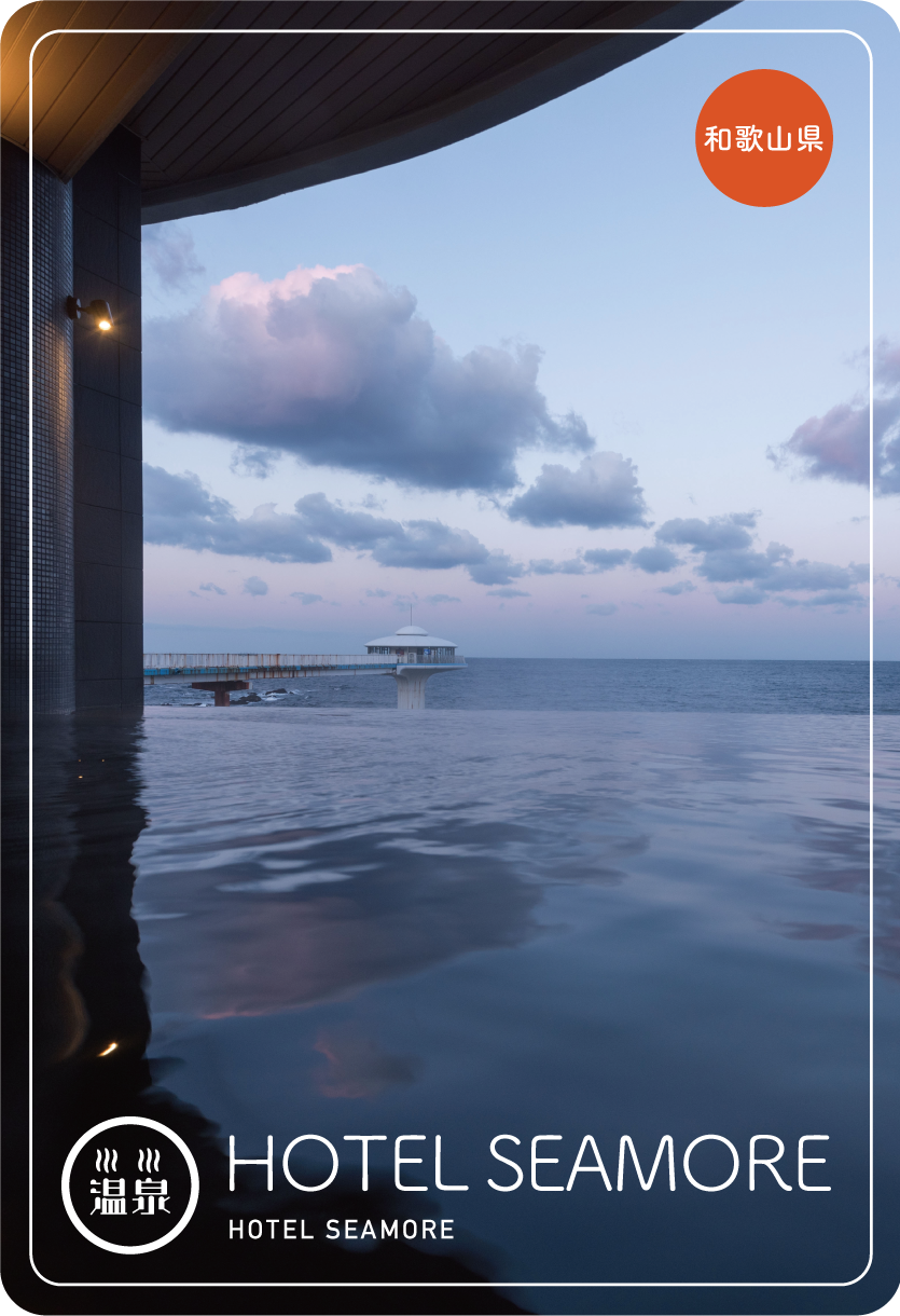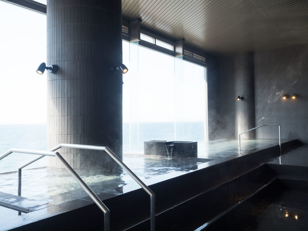 和歌山県西牟婁郡白浜町のHOTEL SEAMOREでは深さ120㎝の立ち湯に浸かりながら、眼前に広がる海と一体感のある湯浴みがお楽しみ頂ける開放的な露天風呂です。