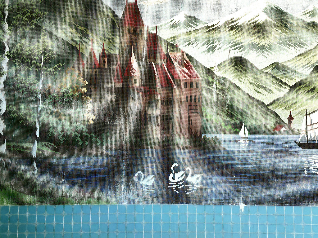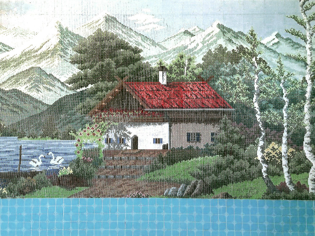 壁全面スイスのレマン湖を想わせるタイル画。
