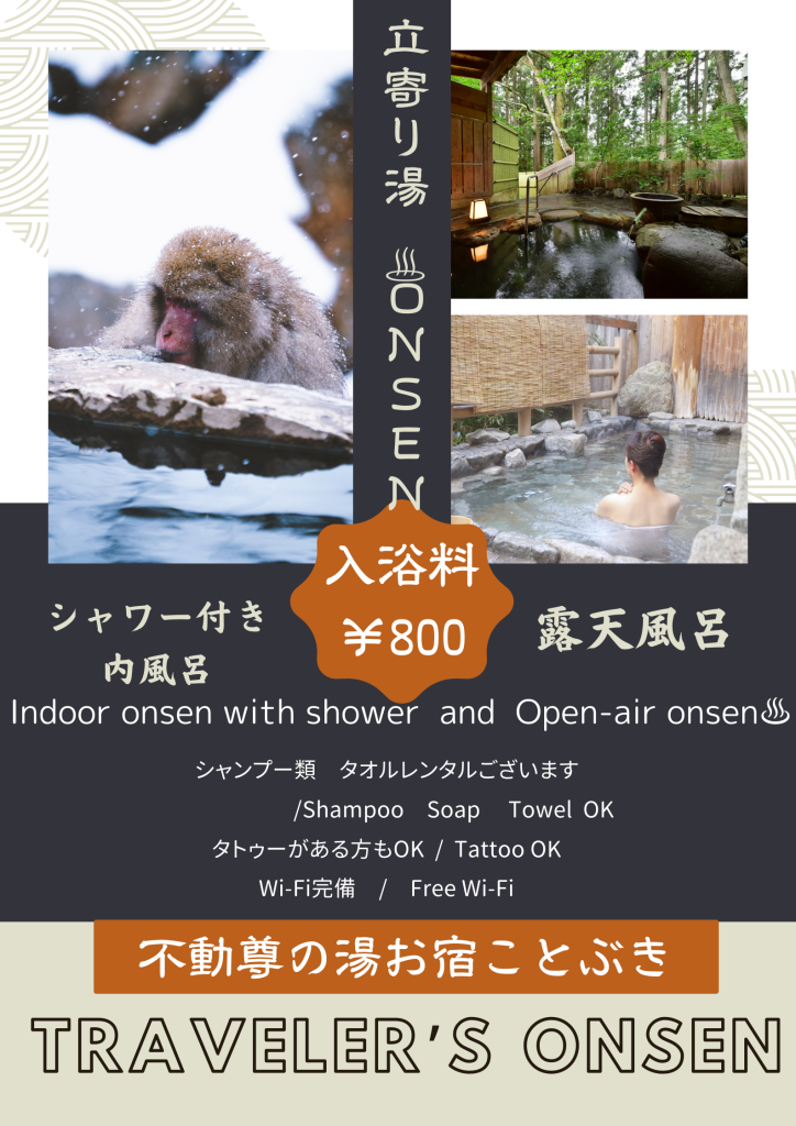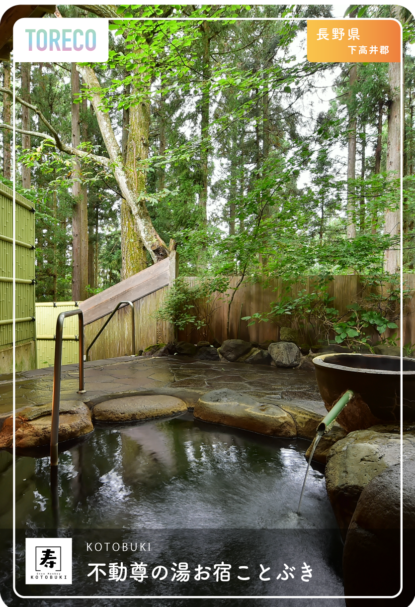 | おすすめポイント | 日本百名湯の湯、上林温泉不動尊の湯お宿ことぶき。 スノーモンキーの入口に位置し、日帰り温泉も不定休で営業中です。 |