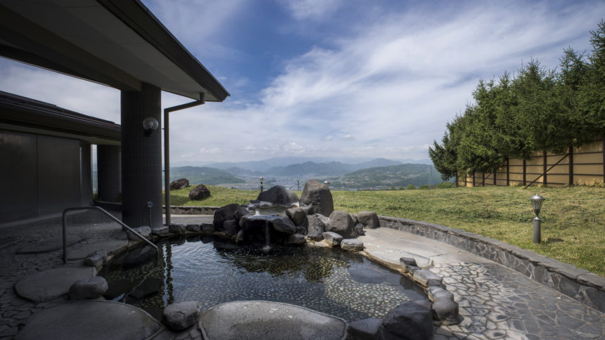 美しい山々とぶどう畑に囲まれた高台に湯楽里館はあります。