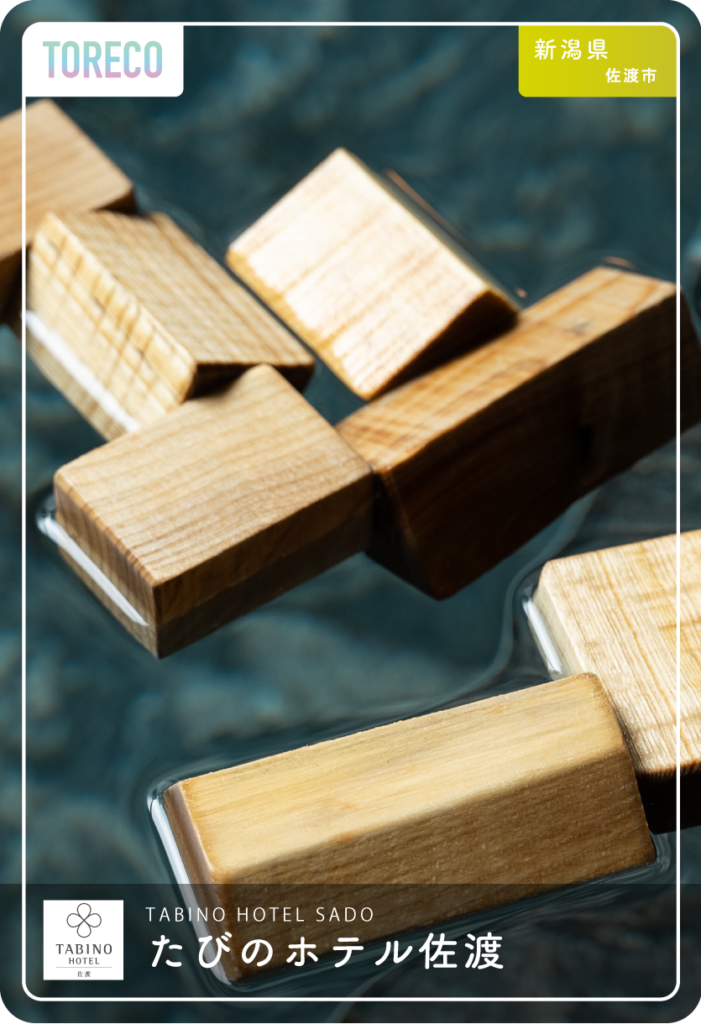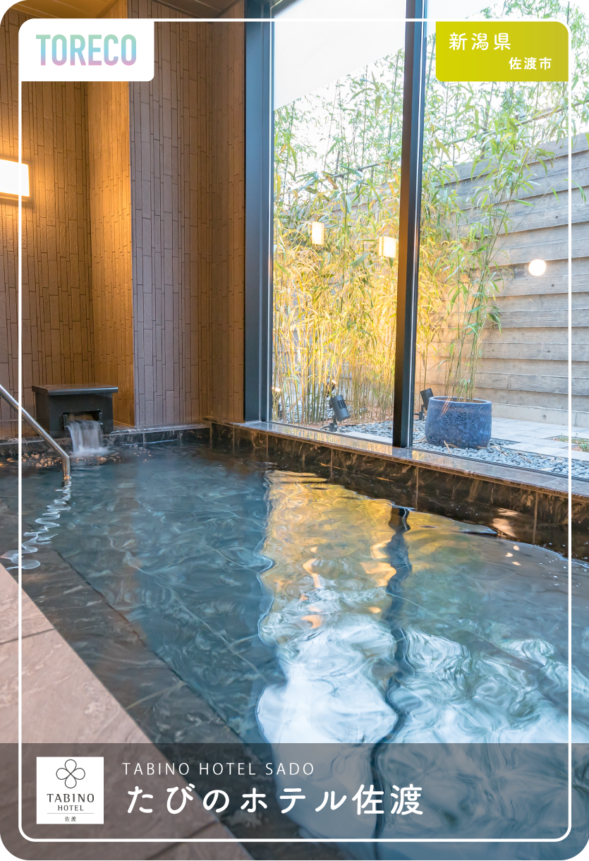 | おすすめポイント | 『たびのホテル佐渡』の大浴場は海洋深層水風呂(高ミネラル水使用) 佐渡の美しい棚田の前方に広がる佐渡の里海。自然環境豊かな島の水深332mから取水した海洋深層水の成分を活かした大浴場で、旅の疲れを癒し、里海の恵みですべすべお肌に! さらに月曜日は大佐渡温泉を科学的に再現しました「大佐渡の湯」、火曜日は佐渡市の木であります「アテビ」をお風呂に浮かべましたひのき風呂をご用意しています |