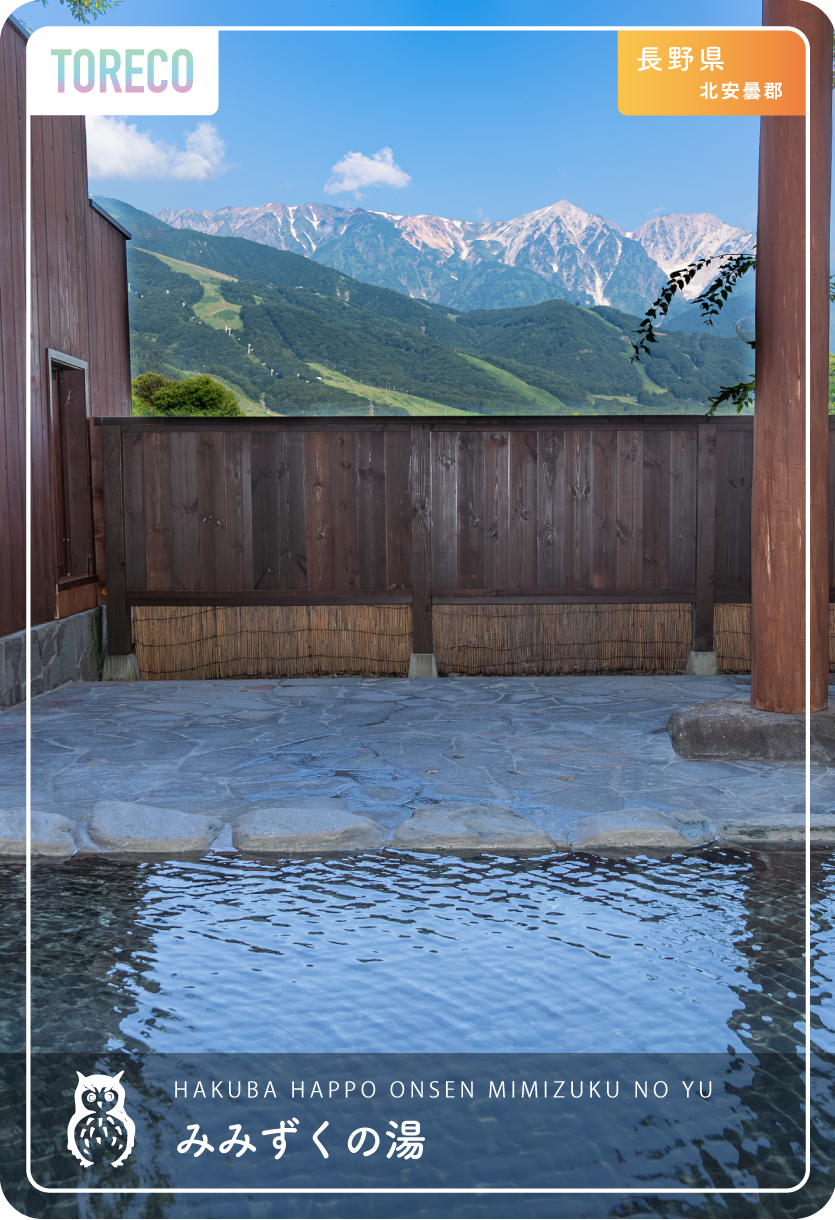 長野県北安曇郡白馬村の白馬八方温泉 みみずくの湯は日本屈指の国際山岳リゾート白馬八方の恵まれた自然の中で、蛇紋岩地帯から湧き出る世界でも希少なpH11を超える日本一の強アルカリ泉。