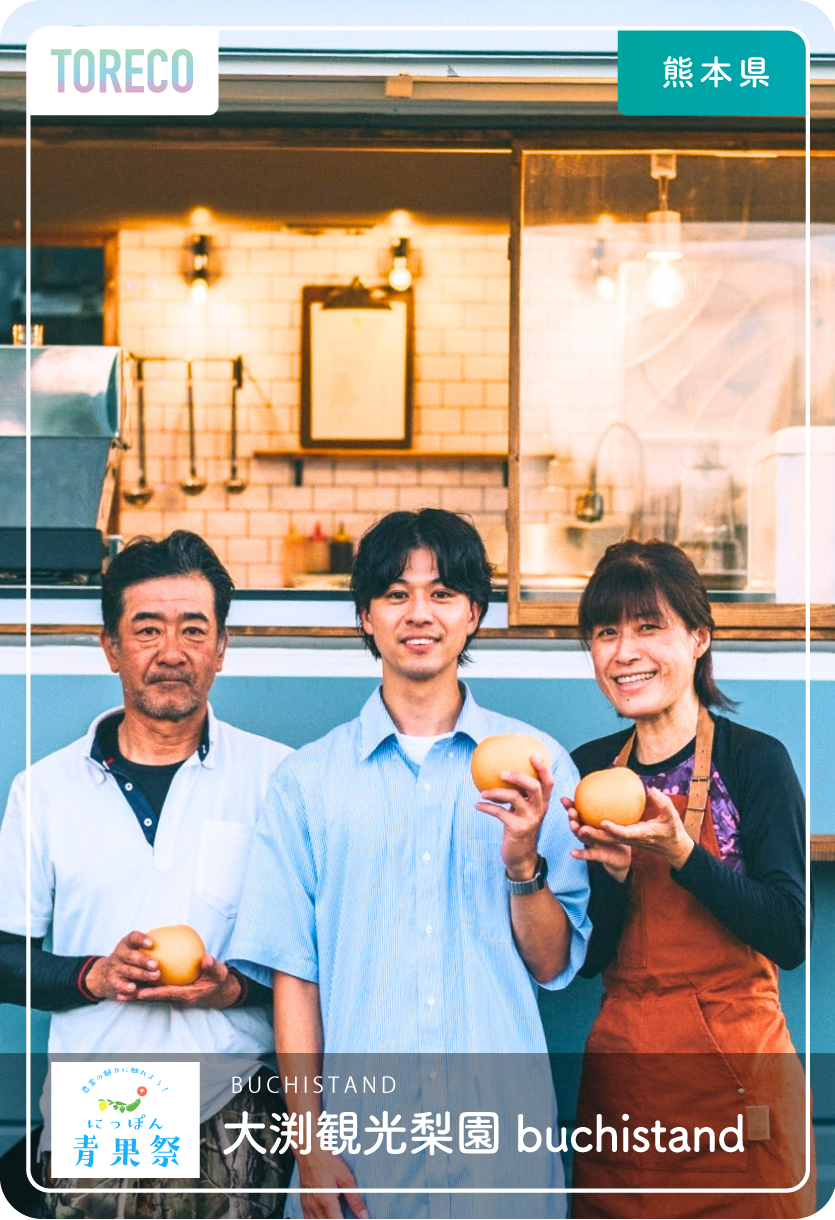 | 特徴 普段活動されていること PRしたいこと | 近年の異常気象による影響で、荒尾梨の廃棄量は5割以上になりました。 僕たちbuchistandはもったいナシをもっとアリに変える活動をしています。 主に店舗やキッチンカーで熊本を中心に梨スムージーなどを販売しています。 |