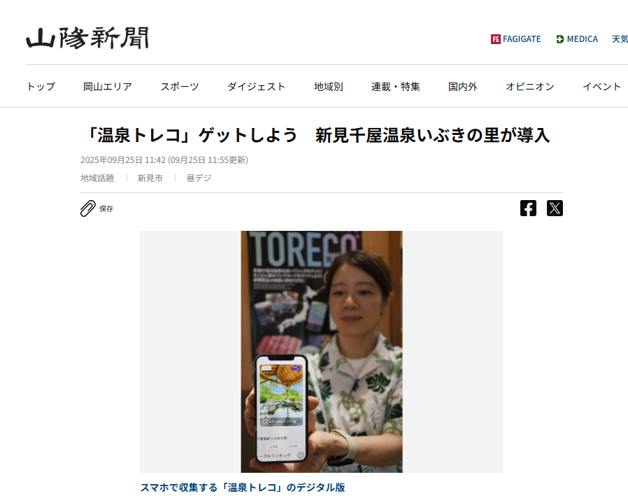 温泉トレコの導入は地元の山陽新聞様にも取り上げていただいておりまして、新見千屋温泉いぶきの里様を皮切りに、岡山県での盛り上がりが期待できますね!