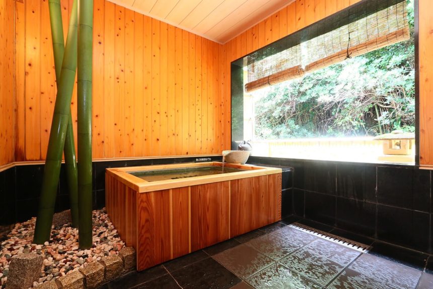 三重県鳥羽市の海女の宿 ひょうすけでは、海景色を望む陶器風呂、やさしい緑の光に包まれた檜風呂と、二種類の貸切風呂をお好みに応じて選べます。海を眺めながらの温泉は、最高に贅沢なひととき。貸切温泉で満喫してください!